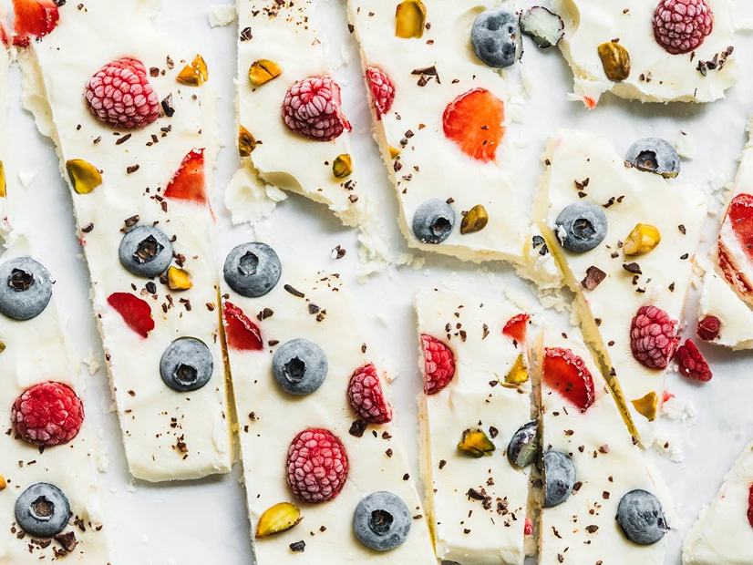 Decore o preparado de iogurte com os restantes pistácios e mirtilos, as framboesas e os morangos fatiados e leve ao congelador durante 6-7 horas (ou até estar completamente congelado). Corte em barras e sirva de imediato.