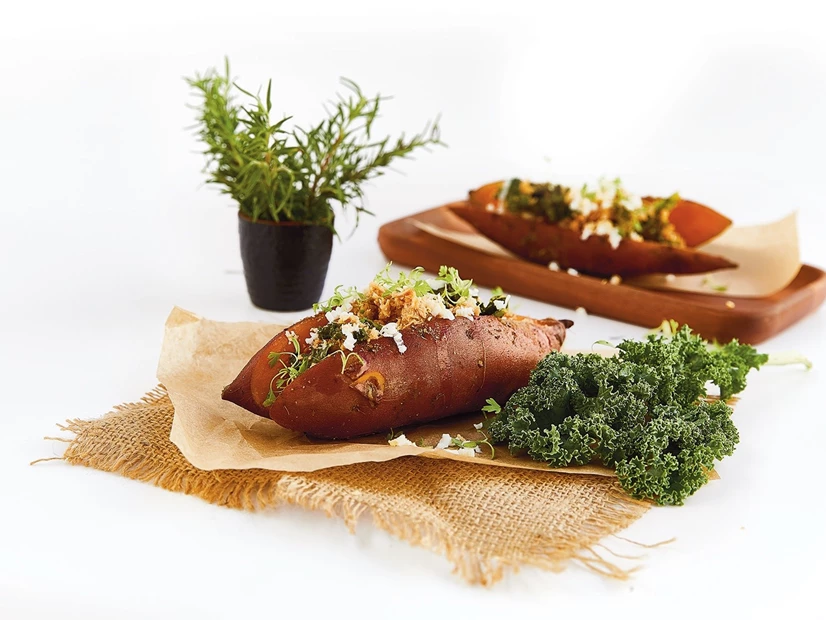 Abra as batatas a meio e recheie com o atum. Polvilhe com o ovo ralado e as sementes e sirva.