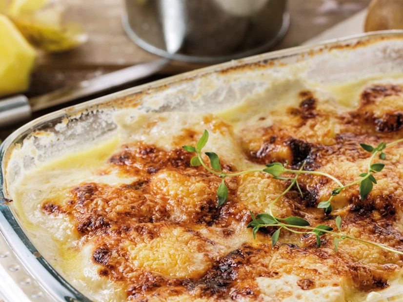 Sem lavar o copo, coloque as natas, o leite, as batatas descascadas e cortadas às rodelas não muito finas, o dente de alho cortado ao meio, sal, pimenta e noz-moscada a gosto. Programe 17 minutos, a 95°C, velocidade 1 na Rotação Inversa.