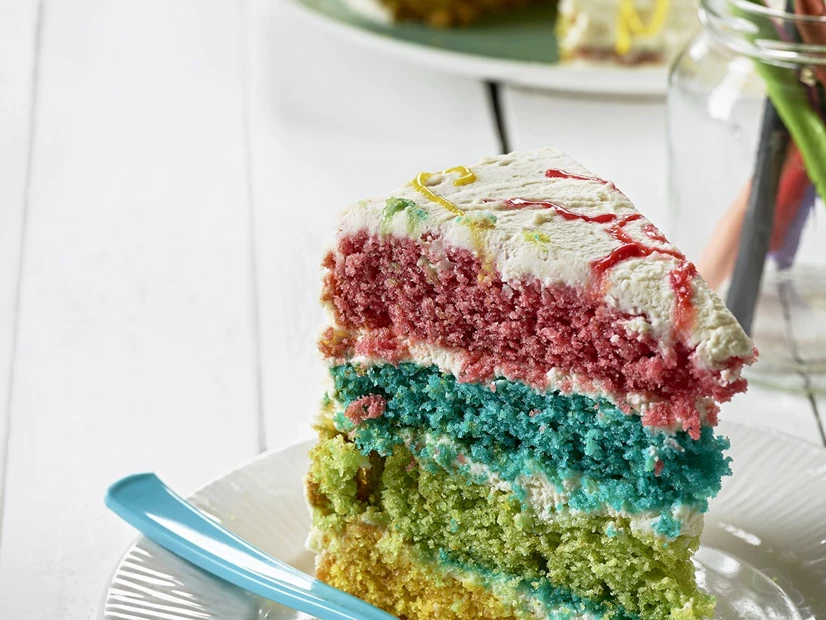 Unte uma forma (com cerca de 23 cm de diâmetro e com fundo amovível) e polvilhe com farinha. Deite a primeira massa (primeira cor) na forma e leve ao forno cerca de 15-20 minutos. retire o bolo do forno, deixe arrefecer e desenforme.
