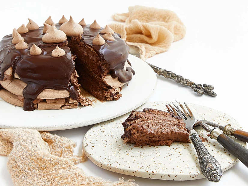 Para montar o bolo, coloque metade da mousse por cima de uma das camadas de suspiro. Coloque por cima outra camada de suspiro, a restante mousse e por fim a última camada de suspiro. Verta a ganache de chocolate no topo, de forma a que cubra toda a superfície e escorra pelas laterais.