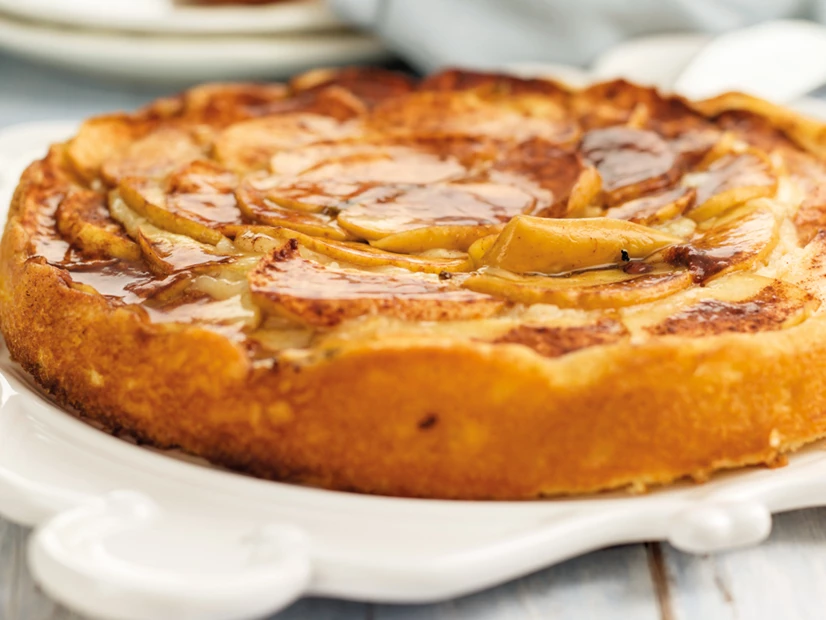 Verta a mistura numa forma de fundo amovível untada com manteiga e disponha as fatias de maçã laminada sobre a massa.