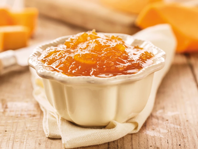 Corte a abóbora em pequenos cubos. Coloque a abóbora no copo e programe 10 segundos na velocidade 8. Com a espátula, faça descer os pedaços acumulados na parede do copo.