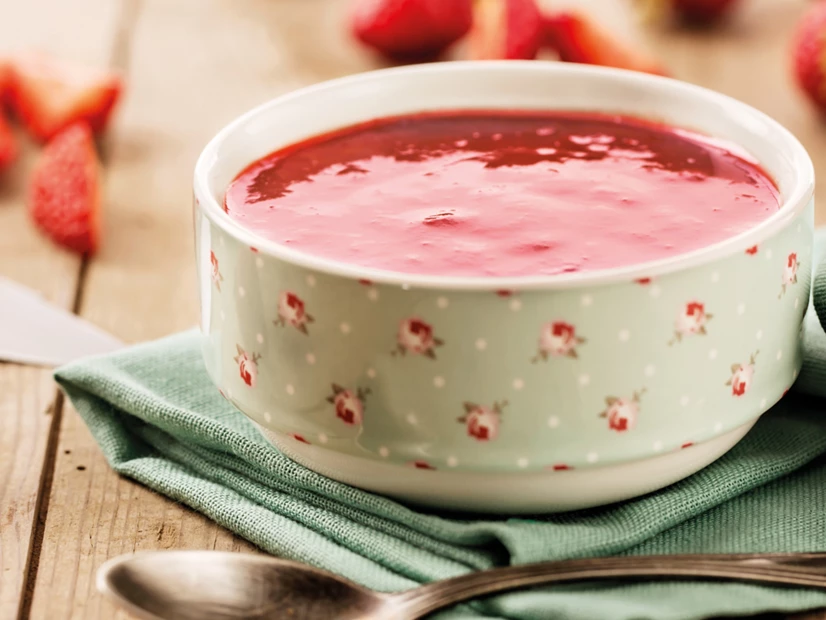 Arranje os morangos: retire‑lhes o pé e corte‑os aos pedaços.