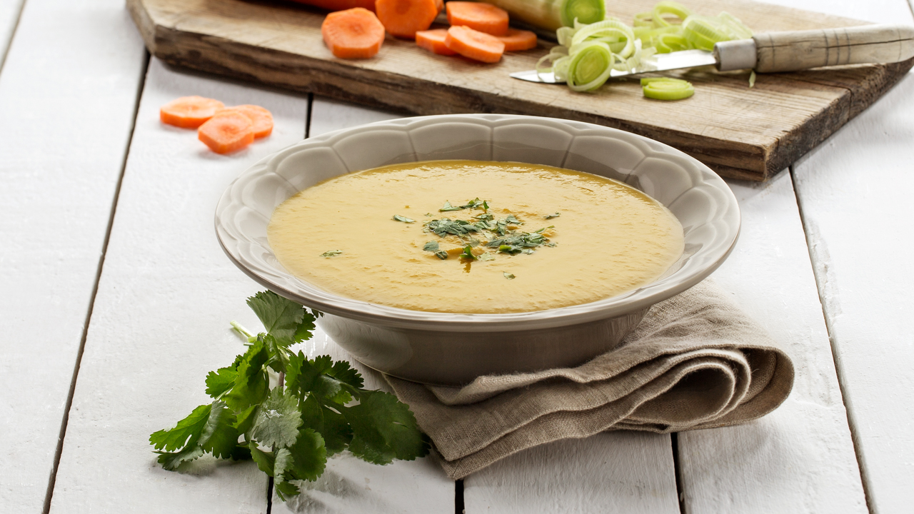 Sirva o creme em taças ou pratos de sopa, com uma colher de iogurte grego natural e o presunto por cima.