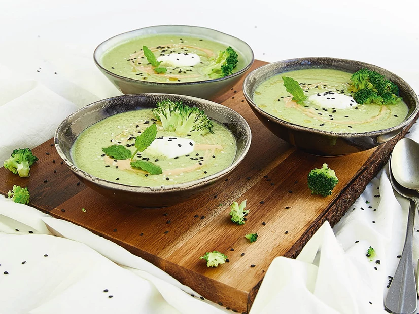 Retire os ramos de brócolo e coloque no copo. Triture o creme durante 2 minutos, começando na velocidade 3 e aumentando gradualmente até à velocidade 8.