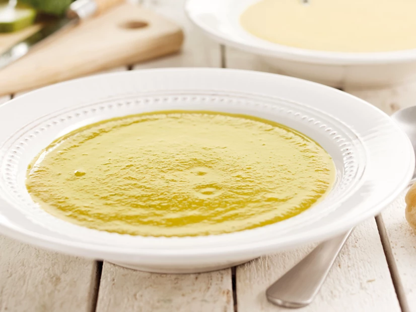 Corte a curgete, o alho‑francês e os coentros em pedaços, coloque‑os no copo e pressione a Função Triturar.