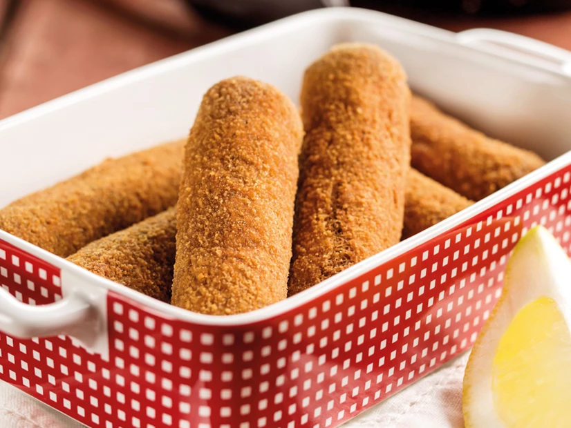 Molde os croquetes e passe-os por farinha, retirando bem o excesso. De seguida passe-os por ovo batido e, por fim, pelo pão ralado. Frite-os em óleo bem quente, para não se desfazerem, e retire o excesso de gordura, secando-os em papel absorvente.