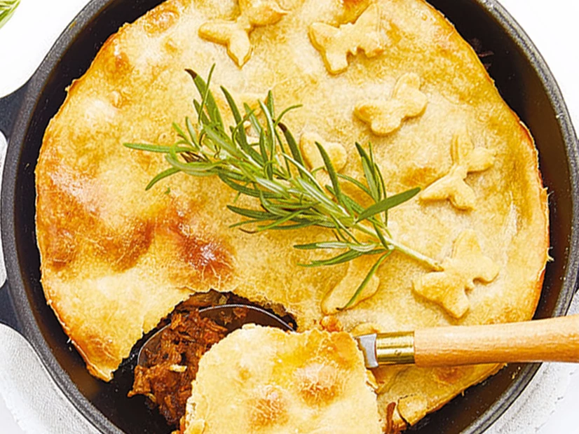 Estique a massa de forma a que fique fina. Coloque a carne numa frigideira que possa levar ao forno, cubra com a massa e decore a gosto.