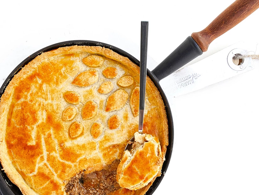 Forre uma forma redonda de 20 cm, de fundo amovível com a massa, ajustando bem no fundo e nas laterais. Remate o excesso com uma faca e recheie com a carne. Decore a empada a gosto com o excedente de massa.
