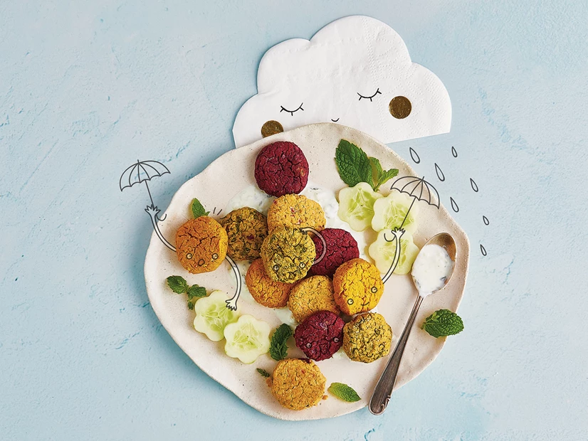 Molde com as mãos pequenas bolas achatadas e coloque num tabuleiro forrado com papel vegetal. Leve ao forno durante 25 minutos.