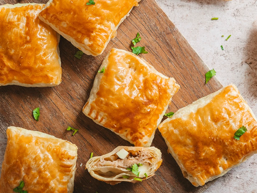 Coloque os folhados sobre um tabuleiro forrado com papel vegetal. Pincele-os com gema de ovo e leve ao forno cerca de 25 minutos.