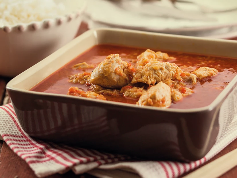 Adicione o frango cortado aos pedaços e refogue durante 10 minutos, a 100 °C, Rotação Inversa na velocidade 1.