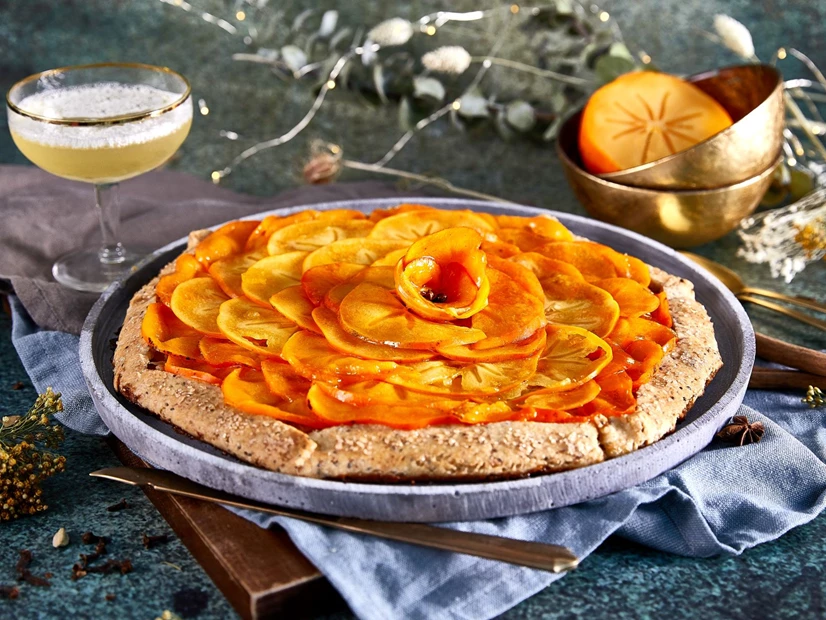 Estenda a massa numa superfície enfarinhada com um rolo, dando-lhe uma forma circular. Espalhe por cima o mascarpone com as especiarias e cubra com as fatias de dióspiro. Dobre as bordas da massa para dentro, pincele a massa com a calda e polvilhe com um pouco de açúcar mascavado. Leve ao forno num tabuleiro forrado com papel vegetal a 200ºC, durante 40 a 50 minutos.