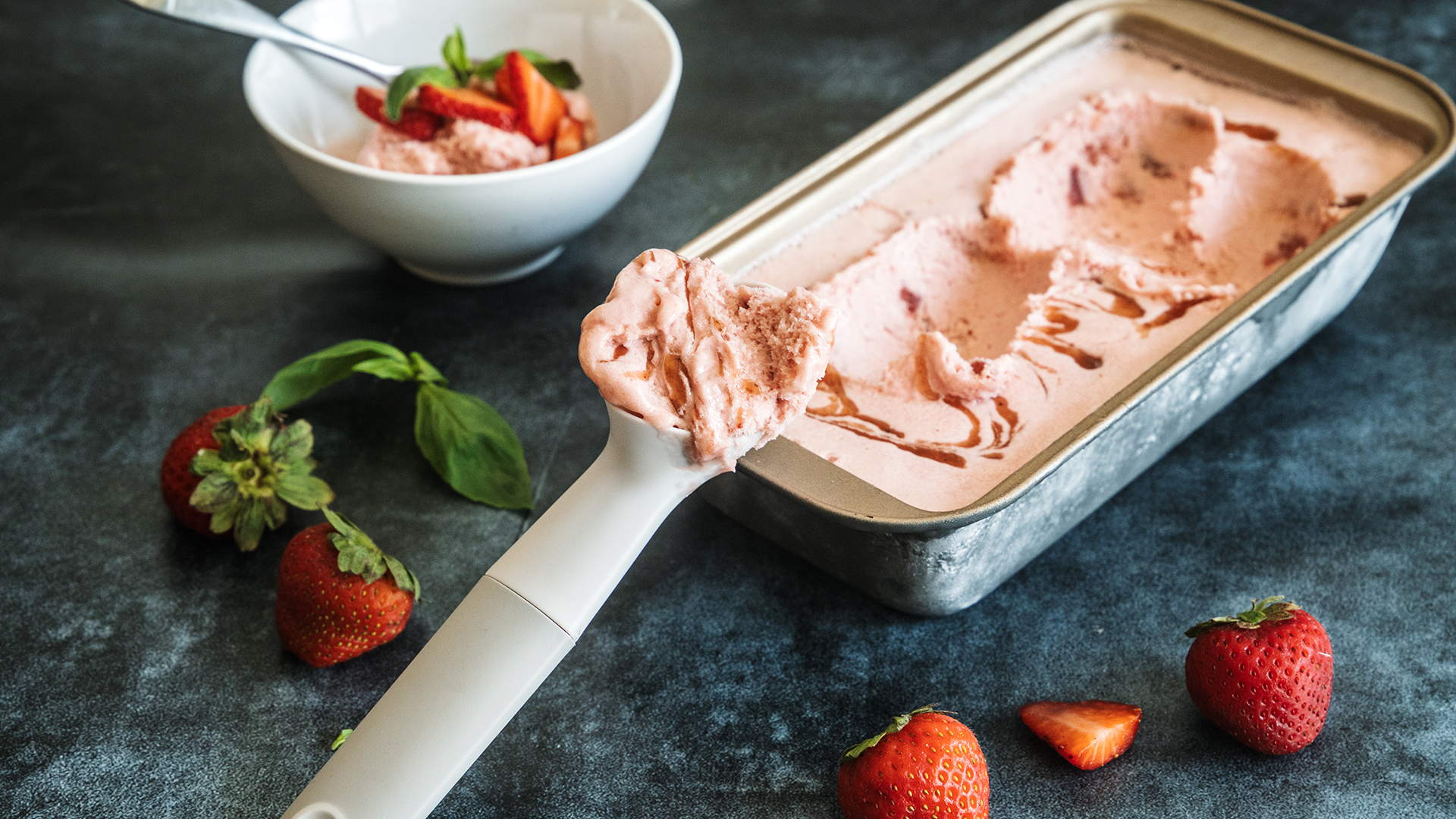 Sirva o gelado com morango fatiado e decore com folhas de manjericão.