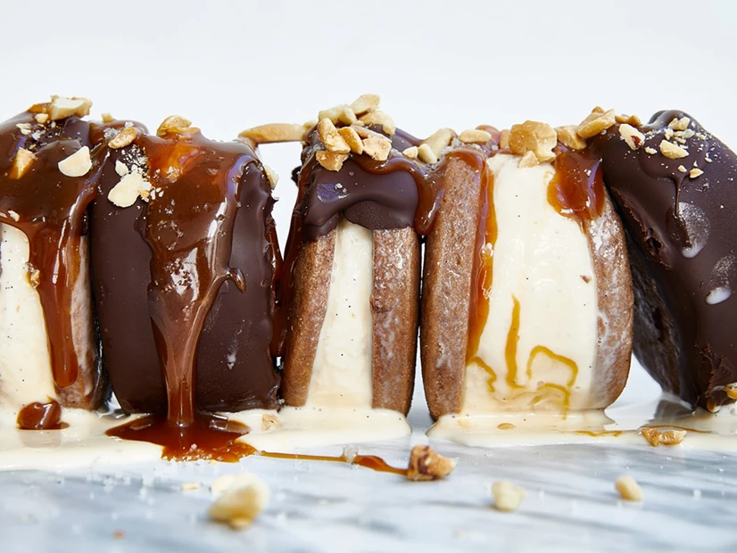Distribua o gelado entre duas bolachas e mergulhe cada sanduíche até metade no chocolate. Passe de seguida pelo amendoim torrado e verta o toffee. Polvilhe com flor de sal a gosto.