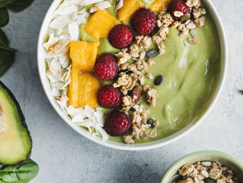 Coloque no copo a couve-flor e a manga congeladas, o abacate em pedaços, o espinafre baby, o iogurte, o leite e o Mix Leve Supla e programe 1 minuto na velocidade 11.