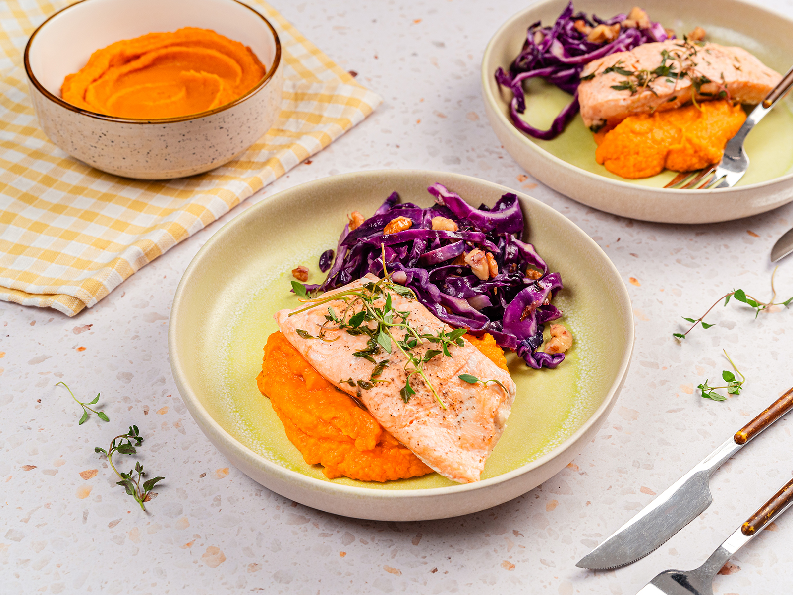 Coloque na panela a água. Disponha os lombos de salmão no tabuleiro inferior da bandeja de vapor. Tempere-os com sal a gosto. Monte a bandeja de vapor sobre a panela e programe 10 minutos na Função Vapor.