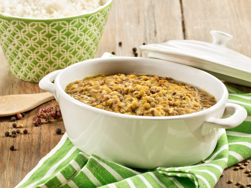 Adicione as lentilhas escorridas, a água e o caldo de legumes e coza 20 minutos, a 100°C, velocidade 1 na Rotação Inversa. Retifique os temperos, se necessário.