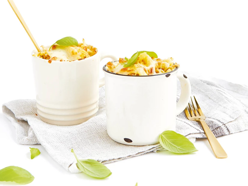 Distribua a massa em canecas ou taças pequenas, polvilhe com o queijo mozzarella e o restante presunto grosseiramente picado e leve ao forno durante 15 minutos ou até ficar dourado.