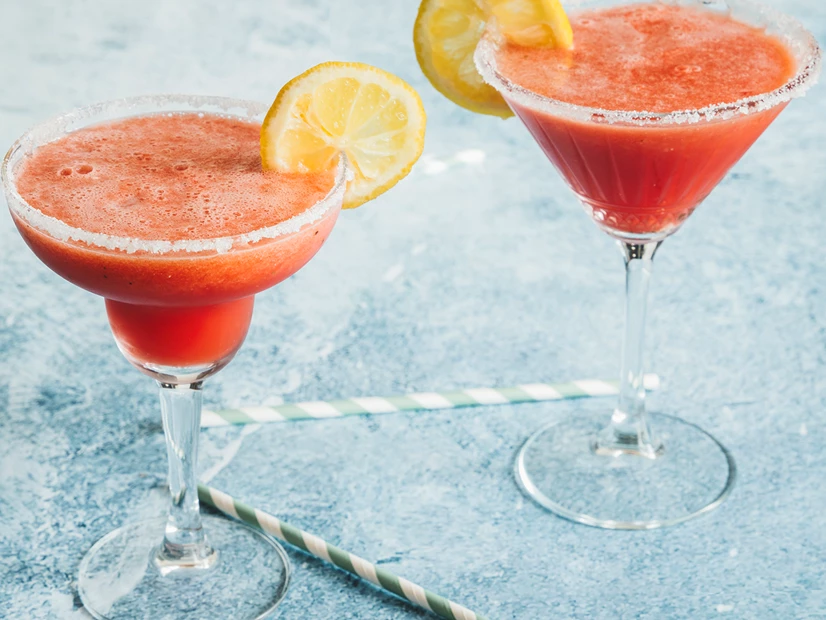 Para servir a margarita: molhe a borda dos copos com sumo de limão e, em seguida, passe por um prato com açúcar.
