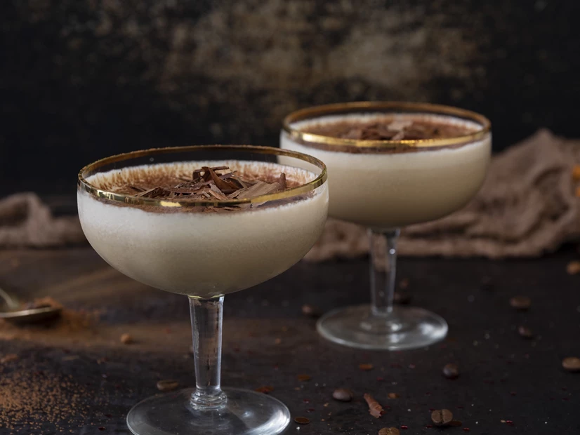 Retire do copo e distribua por 4 taças de champanhe. Polvilhe com o cacau em pó e sirva.