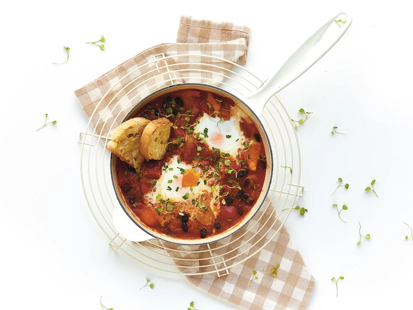 Transfira o preparado para uma frigideira, junte o feijão e abra os ovos por cima. Leve ao forno durante 10 minutos.