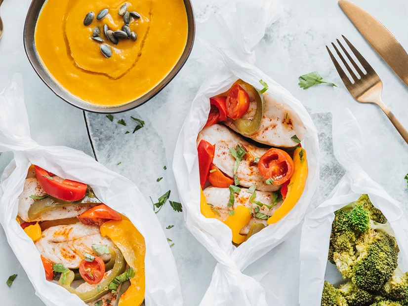 Sirva o creme de abóbora com um fio de azeite, pimenta e sementes de abóbora tostadas. Sirva o peixe em papelote como os brócolos.