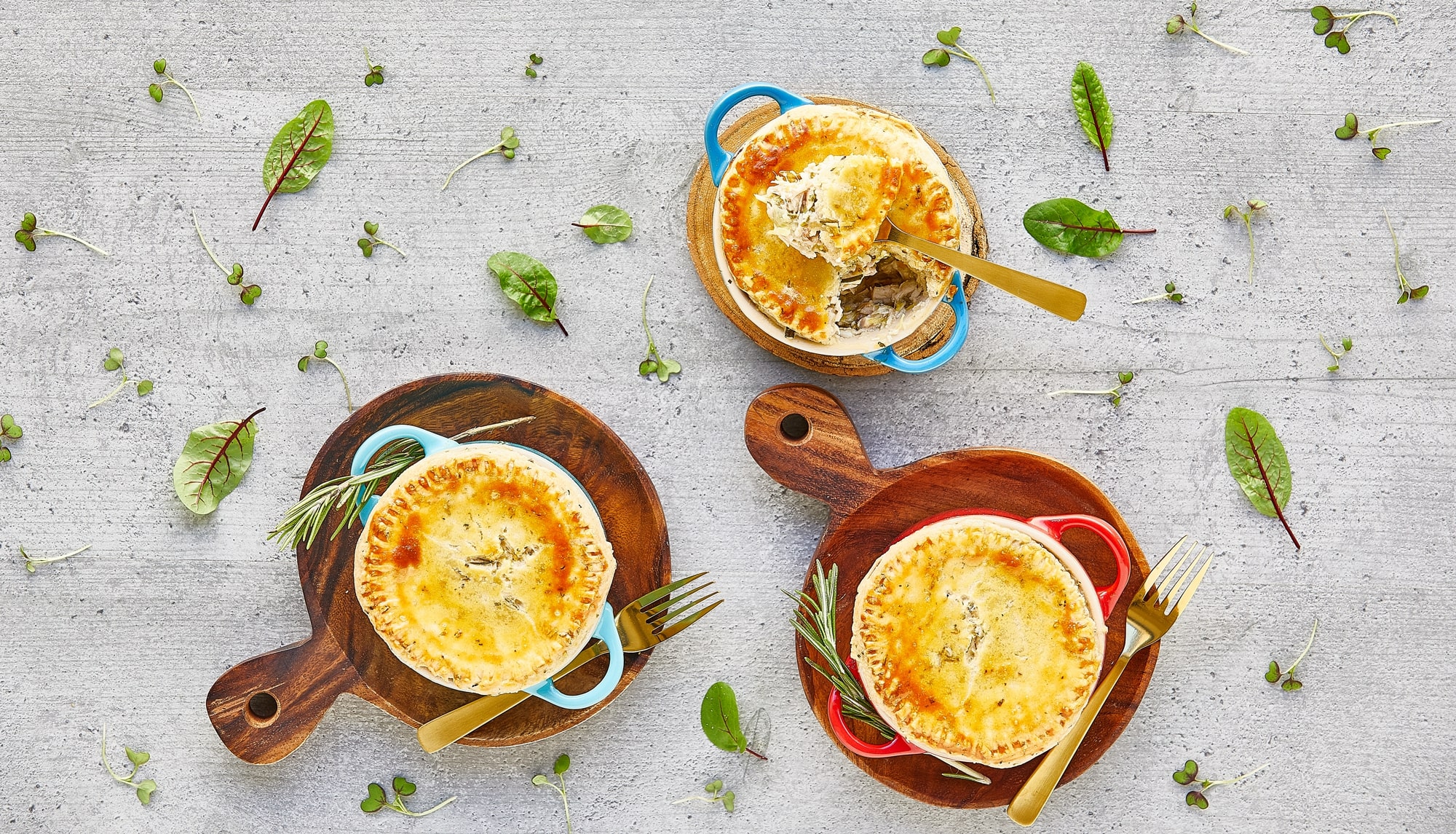 Distribua a carne em pequenas taças ou formas. Corte porções de massa com o diâmetro da taça e cubra a carne com a massa. Pincele com o ovo batido e leve ao forno durante 45 minutos a 1 hora.