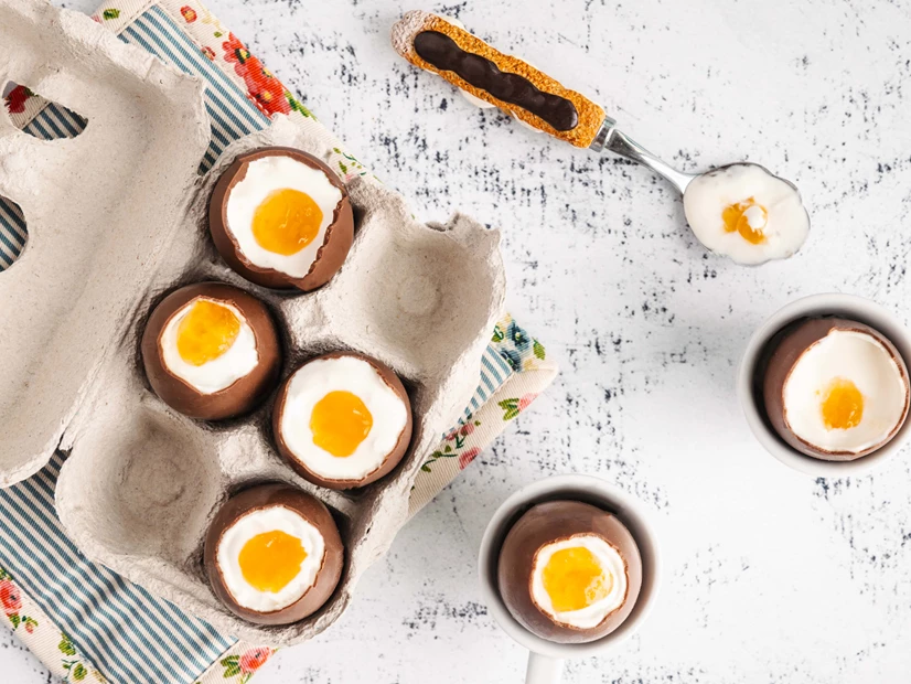 Com uma faca bem afiada, corte uma tampa em cada ovo de chocolate. Reserve.