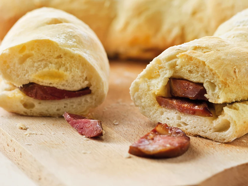 Polvilhe a superfície de trabalho com a farinha e divida a massa em pequenas porções. Estenda cada uma delas, colocando as rodelas de chouriço por cima e fechando os pãezinhos.