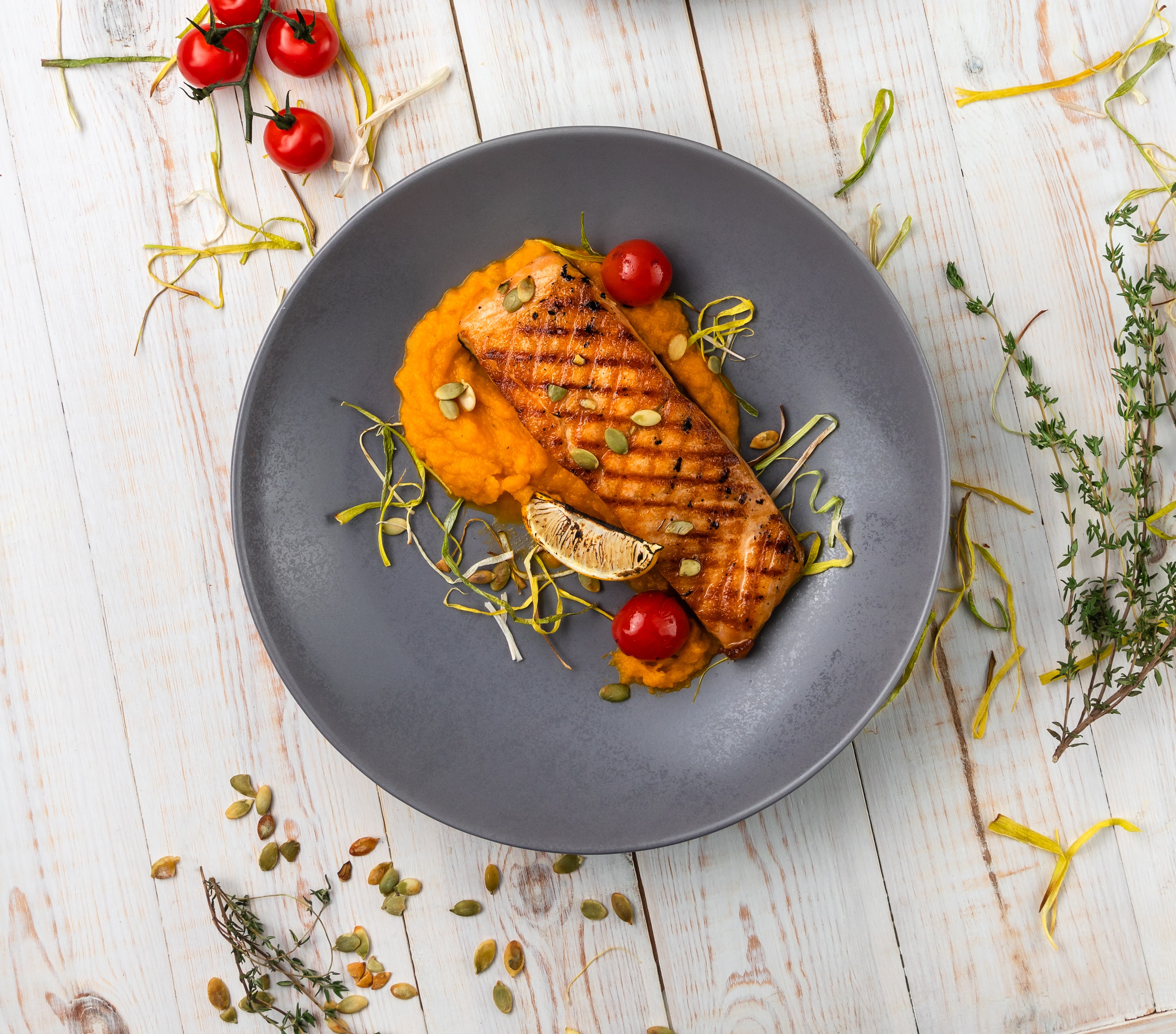 Por cima de cada porção, disponha o peixe e regue com um fio de azeite. Tempere com sal e pimenta e coloque um ramo de tomilho sobre cada pedaço de peixe. Salpique com algumas folhas de coentros e feche‑os bem.