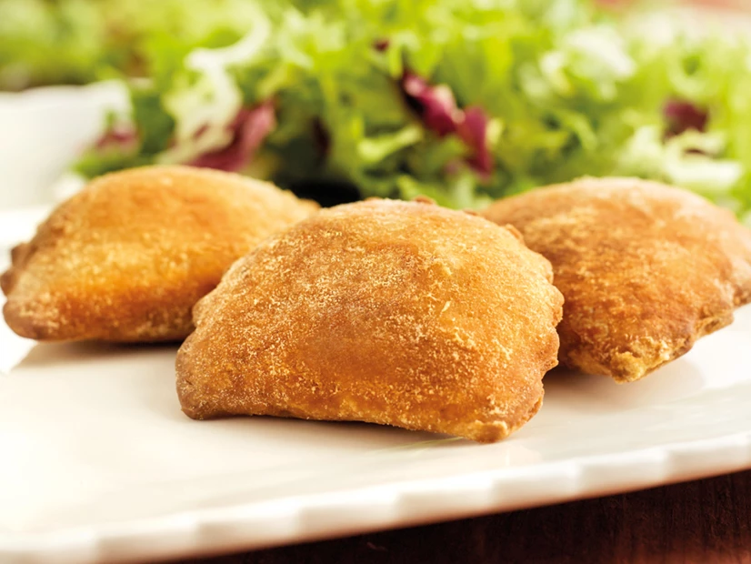 Estenda a massa com um rolo numa superfície polvilhada com farinha, corte-a aos quadrados com um cortador, disponha uma pequena porção de recheio em cada quadrado e feche os pastéis. Frite-os em óleo abundante e bem quente.