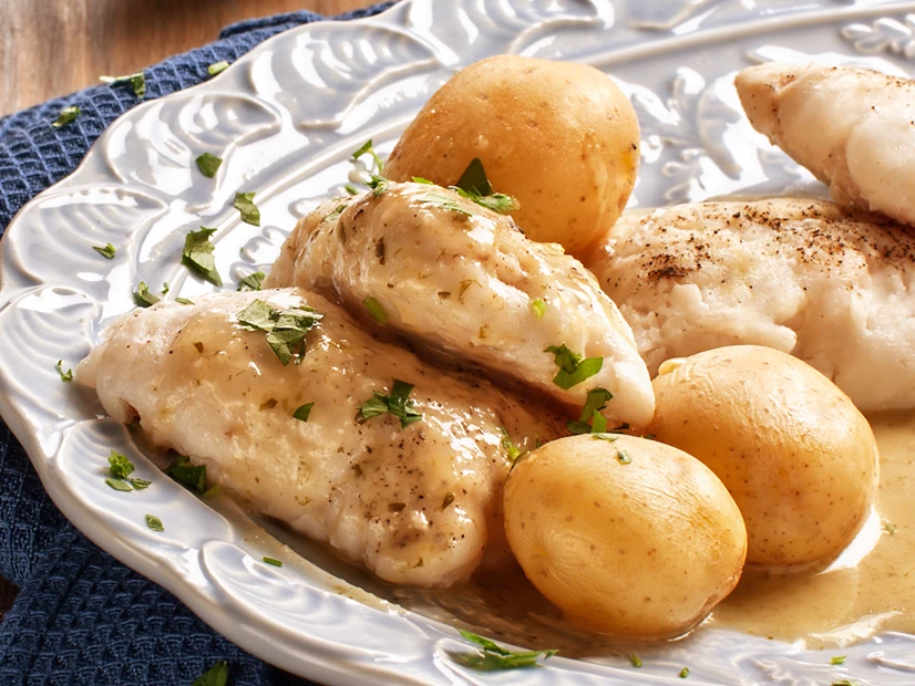 Disponha as batatas e o peixe numa travessa e regue com molho.