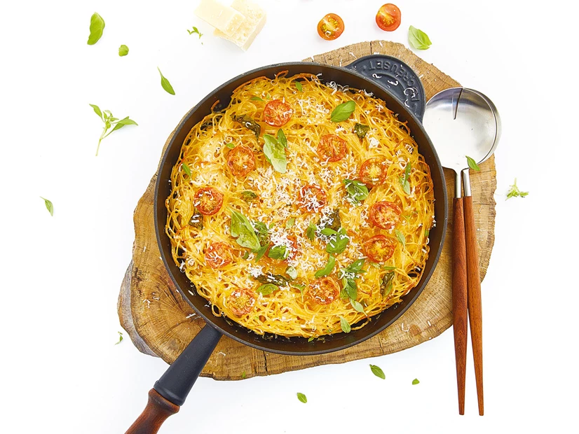 Aqueça uma frigideira que possa ir ao forno com o azeite e frite a massa durante 1 minuto, mexendo sempre.