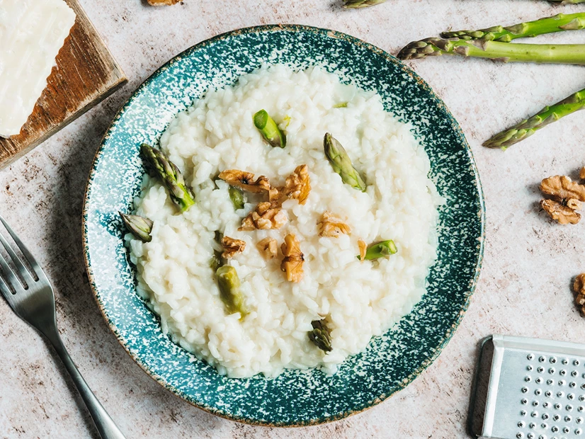 Adicione o vinho, o arroz, o caldo de legumes e os espargos reservados e programe 15 minutos a 100°C na velocidade 1 com a Rotação inversa.