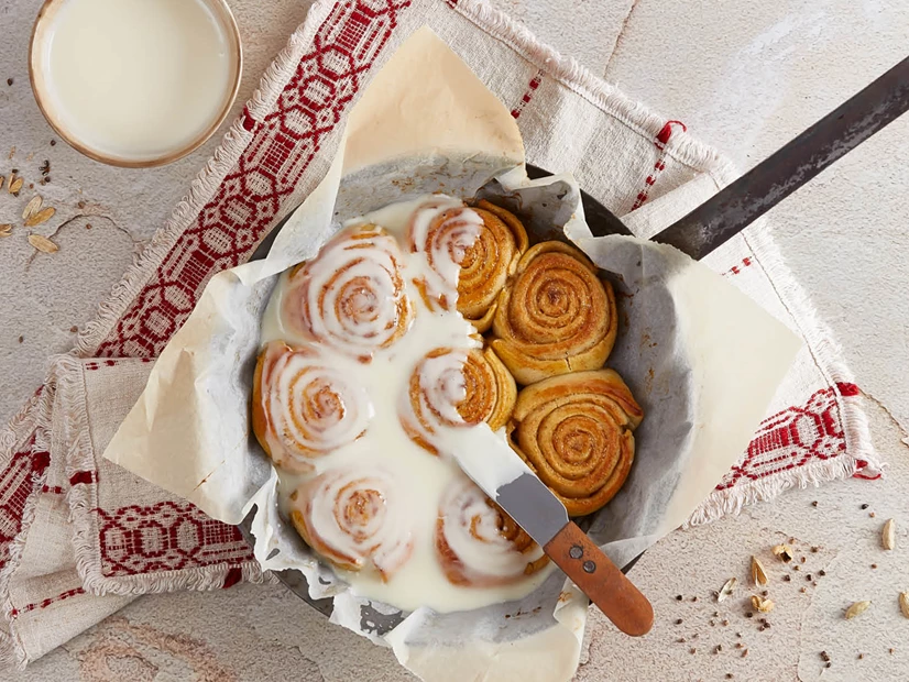 Espalhe a cobertura de queijo creme por cima dos rolinhos de cardamomo e sirva.