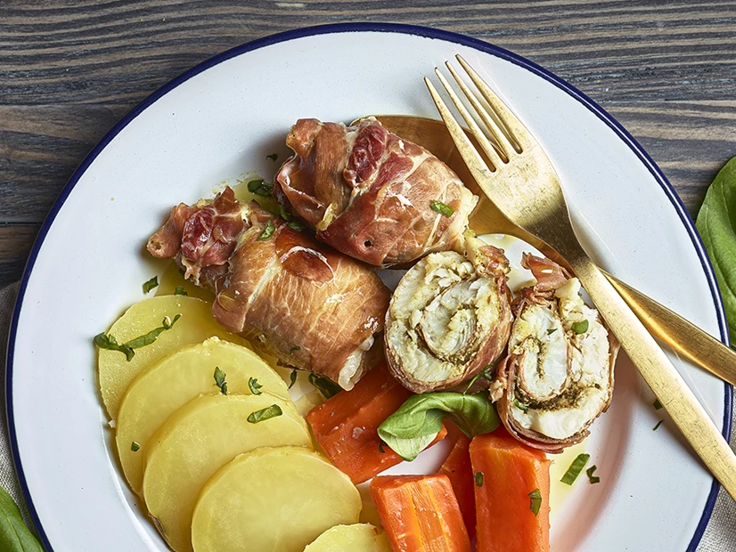 Tempere os filetes (frescos ou já descongelados e escorridos) com sal (tenha em consideração que o presunto e o pesto são bastante salgados) e pimenta a gosto, um fio de azeite e o sumo de limão. Deixe marinar durante 30 minutos.