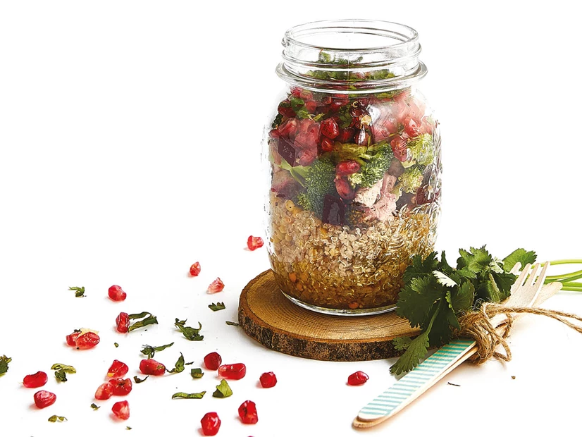 Numa taça, envolva a quinoa e as lentilhas com a beterraba, o brócolo, o frango, as bagas de romã e os coentros. Sirva com o molho.