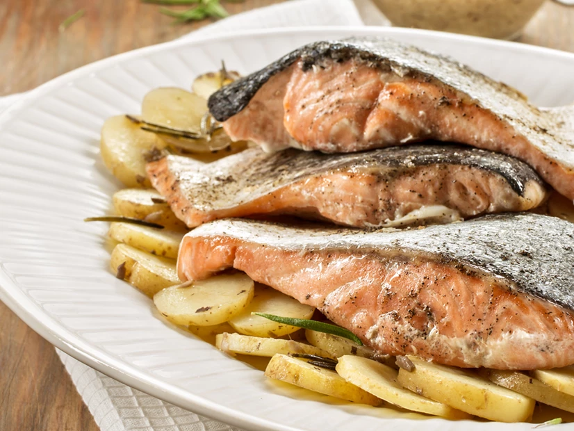 Disponha as batatas no cesto e o salmão na bandeja de vapor. Introduza o cesto no copo e monte a bandeja de vapor sobre o copo, programando 23 minutos na Função Vapor. Verifique a cozedura e, se necessário, programe mais alguns minutos na Função Vapor.