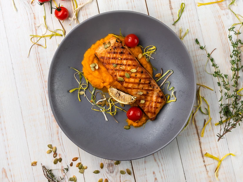 Disponha o salmão e o puré de legumes harmoniosamente no prato e sirva.