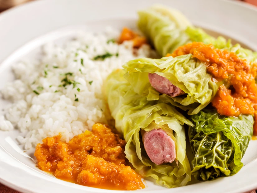 Escalde as folhas de couve-lombarda em água a ferver temperada com sal. Escorra-as bem e enrole as salsichas com as folhas. Disponha-as na bandeja de vapor e reserve.