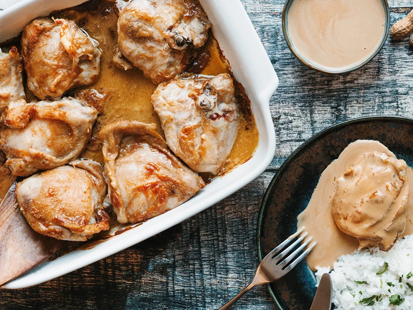 Coloque no copo a manteiga de amendoim, 200 g de água, o mel, o molho de soja, o caril, o sumo de limão, sal a gosto e pimenta a gosto, e programe 30 segundos na velocidade 4. Retire e envolva o frango com este preparado. Deixe marinar durante 30 minutos.