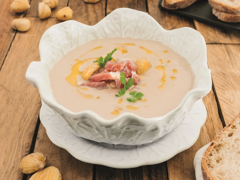 Sirva a sopa de castanha com cubinhos de presunto (opcional) e acompanhe com pão torrado.