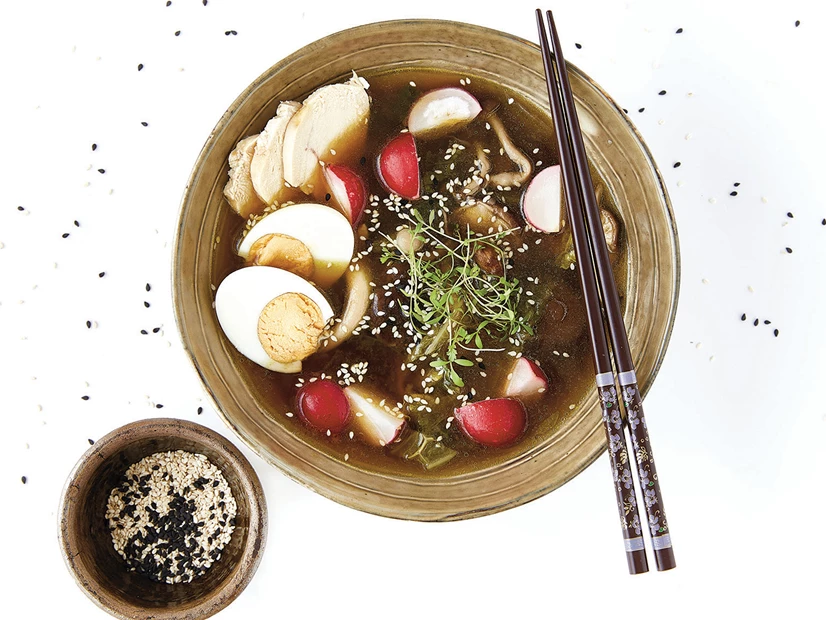 Sirva a sopa miso em taças com o frango fatiado e o ovo e acompanhe com os rabanetes em gomos.