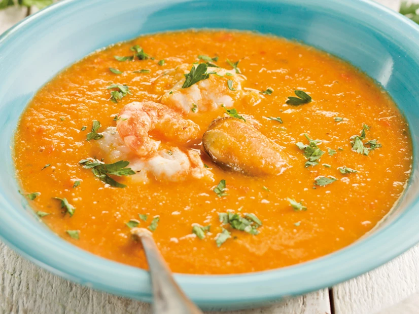 Acrescente os mexilhões, os camarões e o restante pé de coentros picado e programe 5 minutos, a 100 °C, na Rotação Inversa na velocidade 1. Disponha o peixe numa terrina, verta a sopa sobre o peixe e polvilhe com coentros picados. Sirva de imediato.