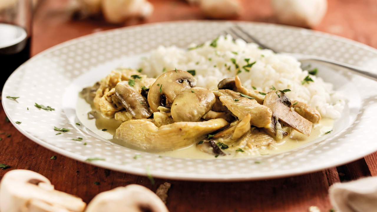 Incorpore as natas e a mostarda, retifique os temperos e programe 7 minutos, 95°C, Rotação Inversa na velocidade 1. Verifique se o frango ficou bem cozinhado. Se necessário, programe mais 1‑2 minutos na mesma velocidade e temperatura.