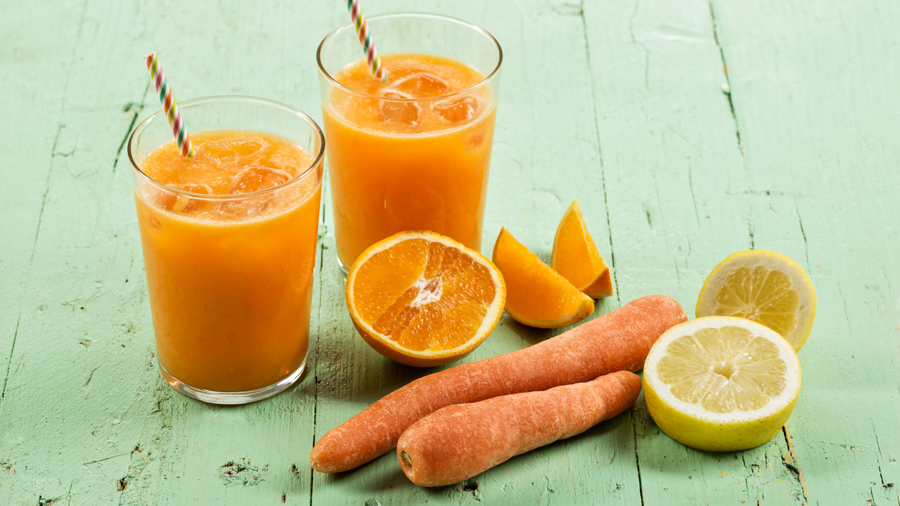Descasque, e coloque no copo, a cenoura aos cubos pequenos, o limão e as laranjas descascados, retirando as pevides e a película branca que os envolve.