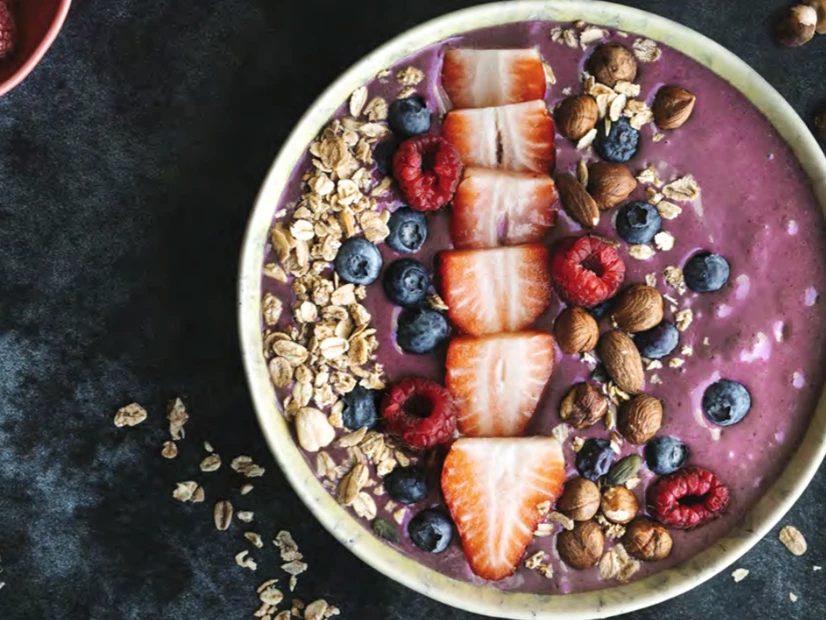 Transfira para duas ou três taças e coloque as coberturas: granola, quivi laminado, frutos vermelhos frescos ou morango laminado, amêndoa ou avelã tostadas. Sirva de imediato.
