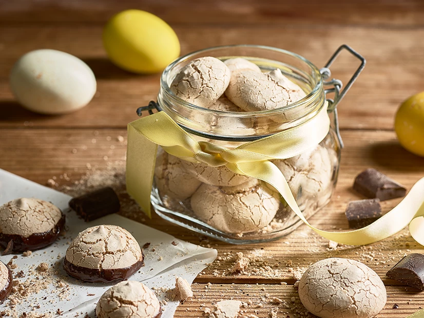 Adicione o cacau em pó e, com a espátula, envolva-o na mistura: muito suavemente, de baixo para cima e só até a mistura ficar matizada (evite misturar demasiado ou bater). Coloque a mistura dentro de um saco de pasteleiro (se não tiver um saco de pasteleiro use uma colher) e faça pequenos montes sobre um tabuleiro forrado com papel vegetal.